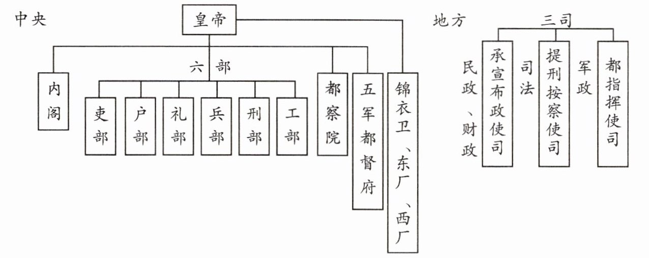 (2)废除丞相,权分六部,使六部直接向皇帝负责;将行中书省的权力一分为三,设立三司;设立锦衣卫、东厂、西厂等。(任答两点)