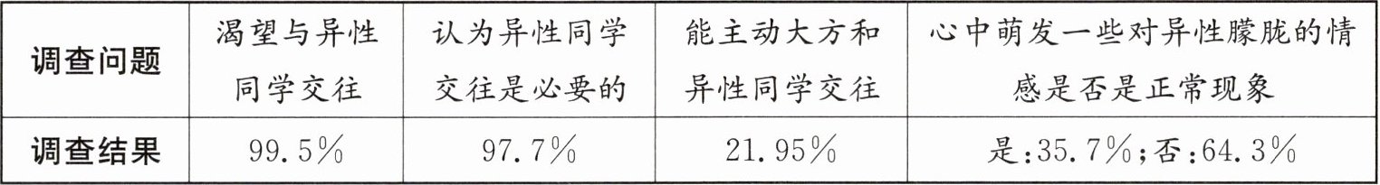 1. 青春时期,异性同学交往备受关注,它对同学们的成长有着重要影响。某校就“异性同学交往”等问题对全校学生进行了调研,结果如下表。该调查结果说明(