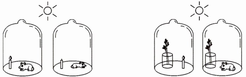在密闭的钟罩中放一枝新鲜的薄荷枝,蜡烛能长时间燃烧,小白鼠也能长时间存活。