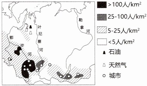 西伯利亚地区是俄罗斯的一个重要开发区,这里针叶林广布。右图为“西伯利亚局部地区人口和矿产资源分布图”。据此完成3-4题。