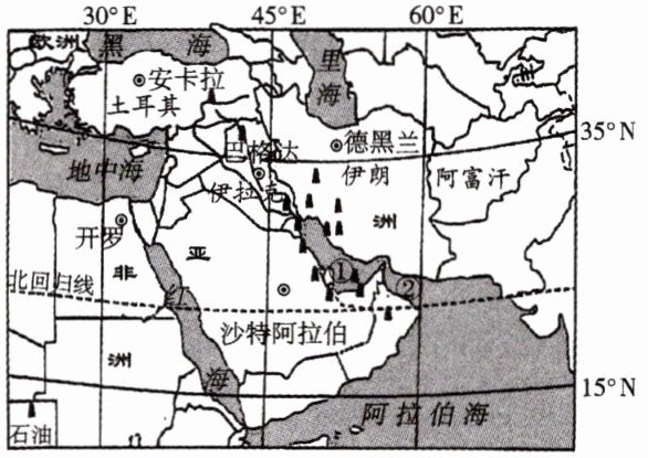 (2)伊朗和沙特阿拉伯都位于①____沿岸。该区域石油丰富,油轮通过②____海峡进入阿拉伯海。