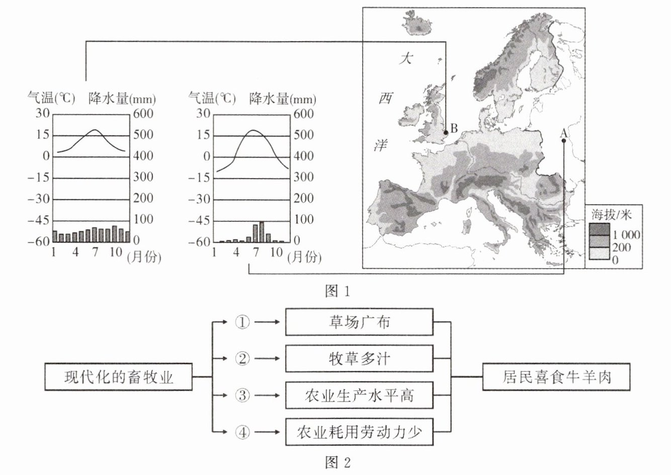 图1为欧洲西部地形图和部分城市气候资料图,图2为欧洲西部畜牧业与饮食结构的关系图。读图,完成1-4题。