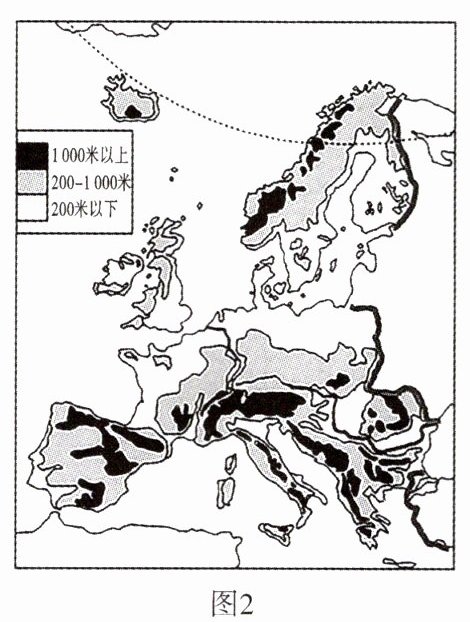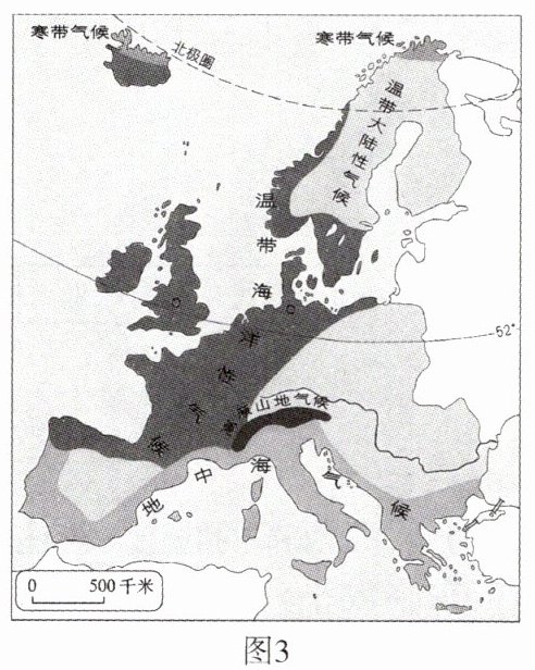 材料二 图1为欧洲西部冬奥会举办地分布图,图2为欧洲西部的地形图,图3为欧洲西部的气候类型分布图。