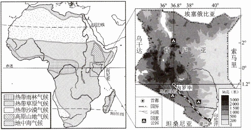 肯尼亚是中国“一带一路”倡议重要的合作伙伴,其农产品(花卉、茶叶、咖啡等)、旅游、侨汇是三大创汇来源。下图为非洲气候类型分布图和肯尼亚地形图。