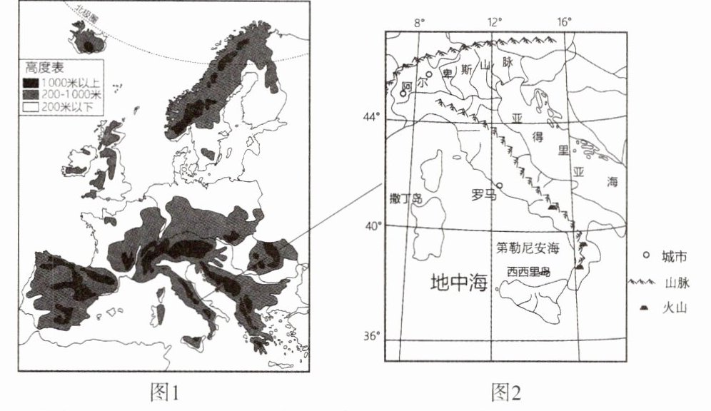 图1为欧洲西部简图,图2为意大利简图。读图,完成1-2题。