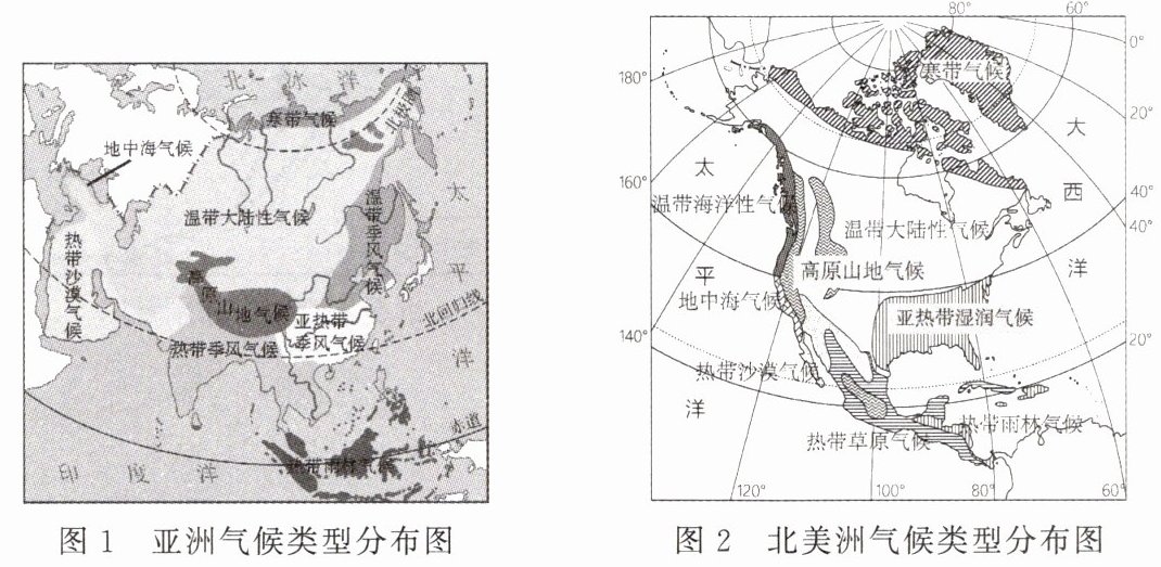 亚洲与北美洲隔白令海峡相望,气候类型既有相同点,又有不同点。读亚洲气候类型分布图和北美洲气候类型分布图。据此完成1-6题。