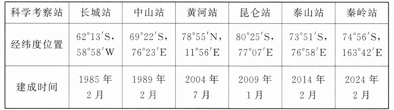 20世纪80年代以来,我国在极地科学考察中取得了举世瞩目的成就。下表为我国极地科学考察站的相关信息。据此完成5-7题。