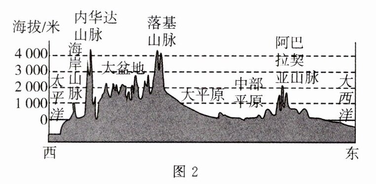 ⑥据图2,北美洲大陆地势高低起伏的大致趋势是______。