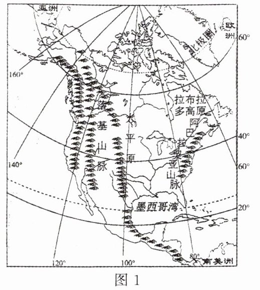 ⑤据图1,北美洲可以划分成西部、中部和东部三大纵列地形区,主要地形类型分别是:西部______,中部______,东部______。