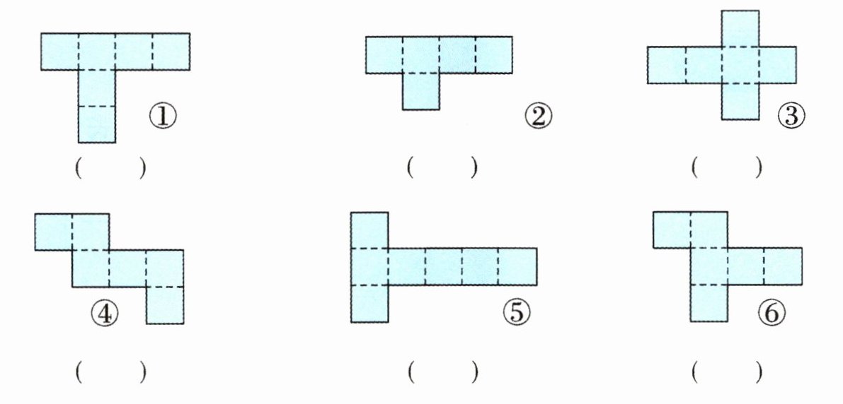 三、沿虚线折叠后恰好能围成正方体(无重叠面)的在下面括号里画“√”,不能的画“×”。