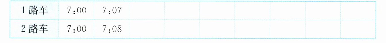 四、1路和2路公共汽车在早上7:00同时从起始站发车,1路车每7分钟发一辆,2路车每8分钟发一辆。列表找出这两路车第二次同时发车的时间。