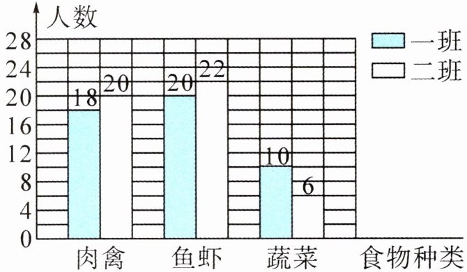 2. 从整体上看,两个班的学生中喜欢吃()的人数最多。