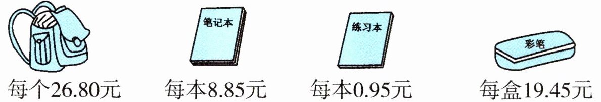 3. 李明付了$100$元,买一个书包和一本练习本,应找回多少元?