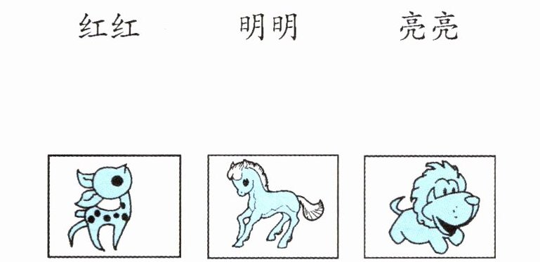 五、红红、明明、亮亮手里各拿了1张动物卡片。亮亮说:“我拿的是鹿。”红红说:“我拿的不是狮子。”他们各拿的是什么动物卡片?连一连。