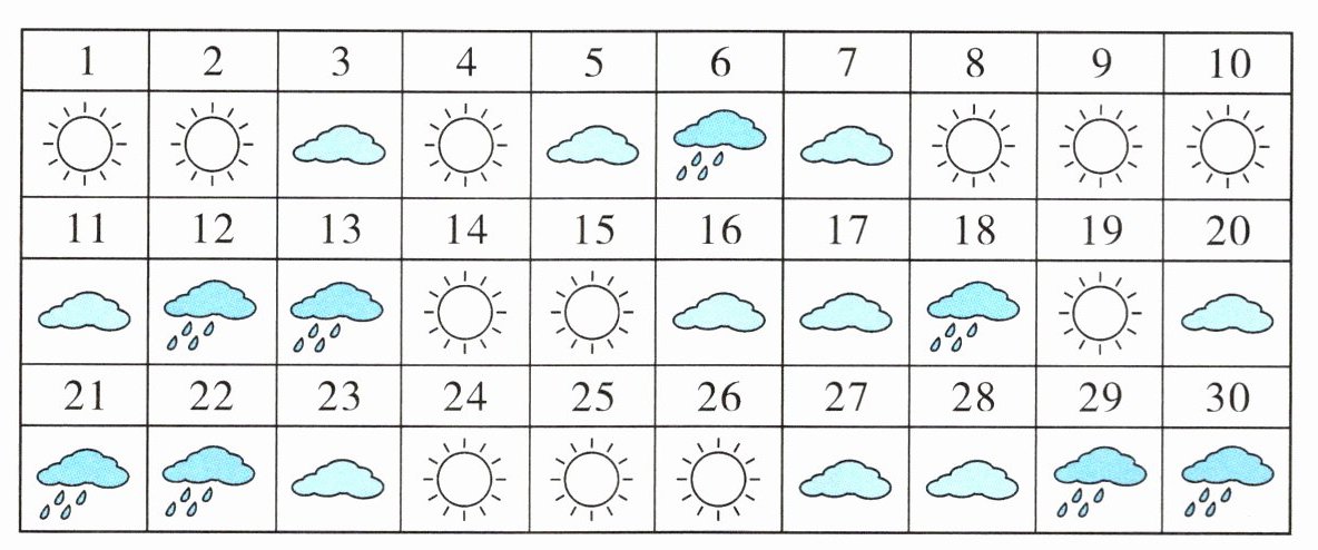 1. 把晴天、雨天、阴天的天数分别填在下面的统计表中。