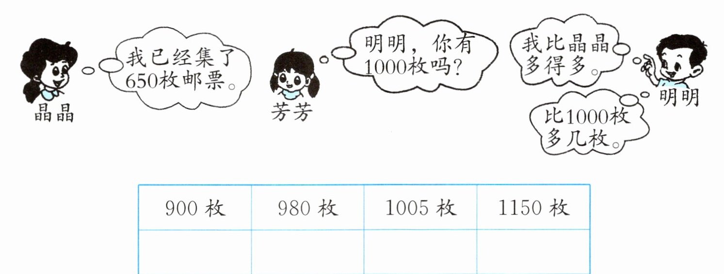 五、明明集的邮票大约是多少枚?在正确答案下面画“√”。