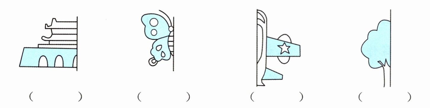四、下面是轴对称图形的一半,想象一下,完整图案是什么样子?填在括号里。