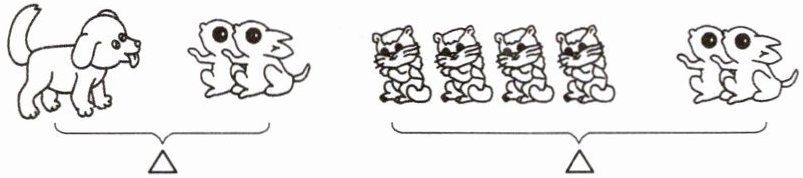 解析:因为1只小狗重4千克,根据图意可知它等于2只小兔的质量,即2只小兔重4千克,1只小兔的质量是 $ 4 ÷ 2 = 2 $(千克)。又因为2只小兔的质量等于4只小猫的质量,所以1只小兔的质量是2只小猫的质量,即1只小猫的质量是 $ 2 ÷ 2 = 1 $(千克)。