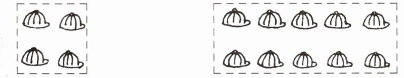 1. 下图中,左边有4顶帽子,右边有10顶帽子,要使左、右两边帽子的顶数相等(每边的帽子最多10顶,最少4顶),你有几种办法?