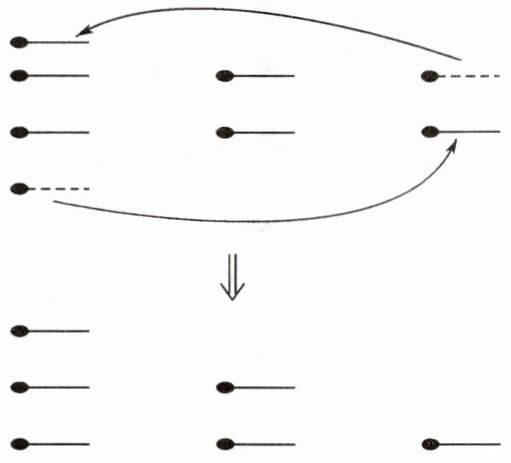 例1 下图由6根火柴棒组成,第一排有3根火柴棒,第二排有2根火柴棒,第三排有1根火柴棒。请你移动其中的2根,变为:第一排有1根,第二排有2根,第三排有3根。