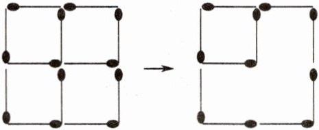 解析:原来12根火柴棒,拿走2根后剩下10根,不可能拼成两个大小相同的正方形,只能是一个大一个小。因此,只要保留原来外面的大正方形,拿去里面的2根,使里面的4个小正方形变成1个就可以了。