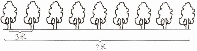 例3 同学们在一段路的一边种树,从路的一头到另一头共种了9棵树,每两棵树之间相距3米。这段路长多少米?