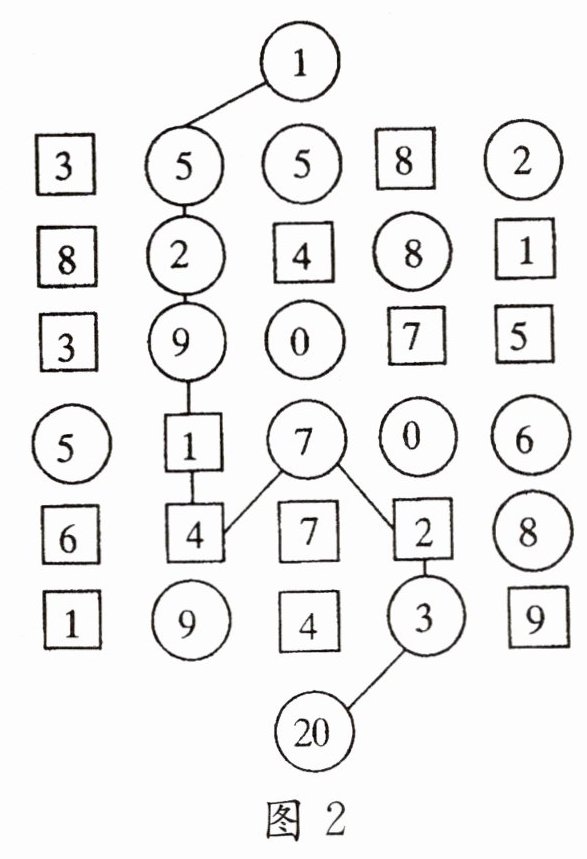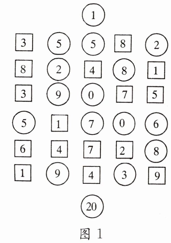 例1 图1从1开始,自己连线试着走,遇到圆形用加法计算,遇到正方形用减法计算,最终等于20,看谁走得又对又快。