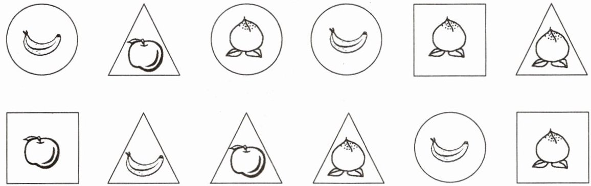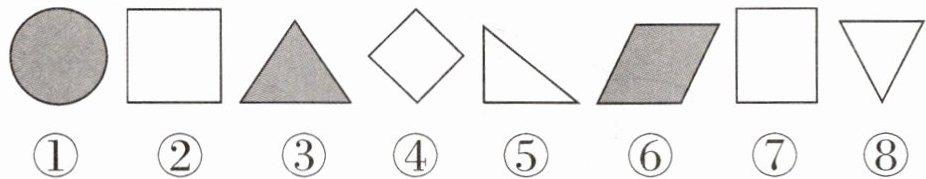按形状分:①是圆形;②④⑦是正方形;③⑤⑧是三角形;⑥是平行四边形。