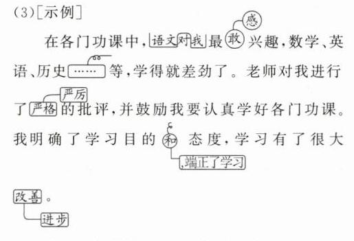 (3)在各门功课中,语文对我最敢兴趣,数学、英语、历史……等,学得就差劲了。老师对我进行了严格的批评,并鼓励我要认真学好各门功课。我明确了学习目的和态度,学习有了很大改善。(用修改符号修改病句)