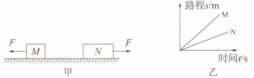 8. 如图甲所示,大小相同的水平拉力 F 分别拉着物体 M、N 在不同的水平地面上做直线运动。此过程 M、N 的路程随时间变化的关系如图乙所示。用$G_{M}和G_{N}$、$f_{M}和f_{N}$、$v_{M}和v_{N}$分别表示 M、N 所受的重力、摩擦力和运动速度的大小,下列判断一定正确的是 ()