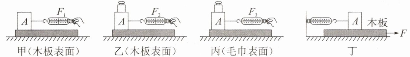 (5)小明在实验中发现,弹簧测力计的示数不稳定,于是将实验装置改进为图丁所示装置。当测力计稳定时,示数为 2 N,当拉力 F 为 5 N 时木板匀速直线运动,则木板与地面间的摩擦为______N。