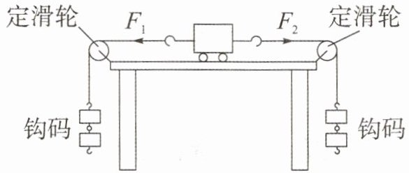 15. 如图所示是用来探究“二力平衡的条件”的实验装置。实验中,每个钩码的质量均为 50 g,忽略摩擦力对实验的影响,$g = 10N/kg$,小车静止在水平桌面上,则小车受到______对平衡力的作用(不计空气的作用),小车受到水平向右的拉力$F_{2}= $______N。