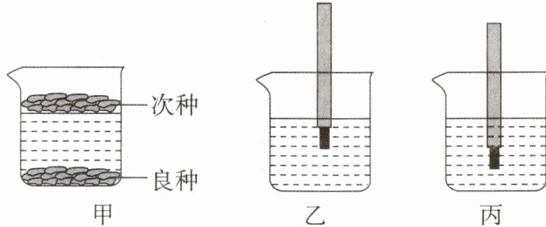 1. 盐水选种是一种常用的选种方法,将待选的种子放入浓度适当的盐水中,良种沉入水底、次种则漂浮于水面,如图甲所示。农民为了方便检验自制的盐水浓度是否合适,在一端封闭的吸管内放入一些铁砂制成了简易密度计。首先将密度计放入标准盐水中,在吸管上标出水面的位置,如图乙所示,再将密度计放入自制的盐水中,如图丙所示。下列说法正确的是()