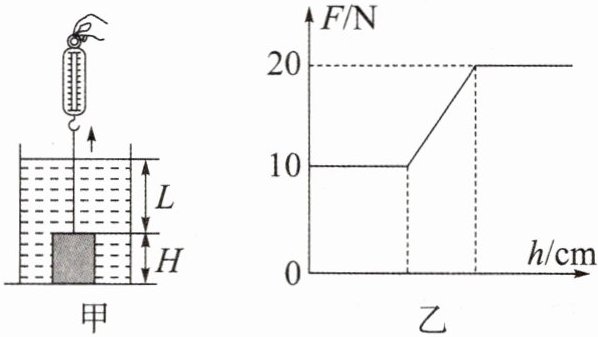 17. 如图甲所示,水平桌面上放着一个盛有适量水的上端开口的薄壁圆柱形容器,水中放置一圆柱体,圆柱体高10cm,其上表面距水面15cm,圆柱体的横截面积为$100cm^2$,容器的横截面积为$300cm^2$,现将圆柱体挂在弹簧测力计下端,将圆柱体匀速缓慢拉出水面的过程中,弹簧测力计示数F随圆柱体上升距离h的变化情况如图乙所示。已知水的密度$\rho_{水}= 1.0×10^3kg/m^3$,水的阻力、容器的重力忽略不计。求:
