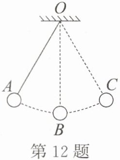 12. 如图,用细线把一个小球悬挂起来,将小球拉到位置A,松开手后小球在A、B、C点之间来回摆动,最后静止在B点。小球从A点摆动到B点的过程中,重力势能______(选填“变大”“变小”或“不变”),机械能______(选填“守恒”或“不守恒”)。小球在A点时,受到的重力和拉力______(选填“是”或“不是”)一对平衡力。
