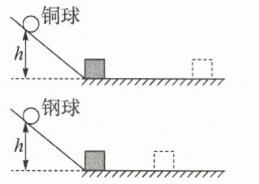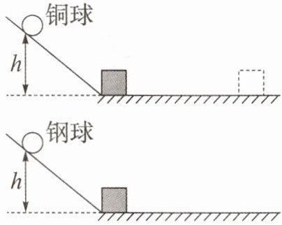 16. 如图所示,在探究影响动能大小的实验中,铜球的质量大于钢球的质量。请你用表示下面图中木块停止的大致位置。
