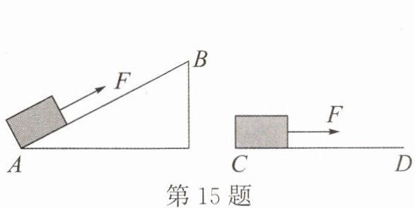 15. 如图所示,用大小相等的拉力F,分别沿斜面和水平面拉木箱,拉力和运动方向始终一致,运动时间$t_AB>t_CD,运动距离s_AB= s_CD,比较两种情况下拉力做的功W_AB______W_CD,功率P_AB______P_CD。$