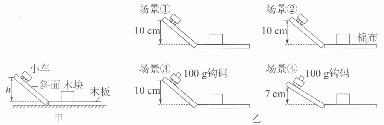17. “探究动能大小与哪些因素有关”的实验装置如图甲所示:将小车从斜面上高h处由静止释放,运动至木板上后与木块碰撞。通过改变小车释放时高度h、在小车中增加钩码和在木板上铺垫棉布的方法,得到了图乙的四个实验场景。