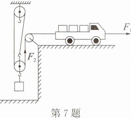 7. 如图所示,汽车通过滑轮组将物体吊起。已知汽车的质量为$3×10^{3}kg$,牵引力$F_{1}$为4000N,对绳子的拉力$F_{2}$为2500N;物体的重力为6000N,物体匀速上升的速度始终为0.5m/s,g取10N/kg,不计绳重和滑轮间的摩擦。下列说法中()