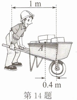 14. 根据陈寿于公元3世纪撰写的《三国志》记载,三国时期的诸葛亮发明了一种新的独轮车形式称作“木牛流马”,现代社会的建筑工地上(如图),石块与独轮车的总重为600N,重心在A点。则工人两手对车所施加向上的力F是______N;要想使F更小一些,你的建议是______。