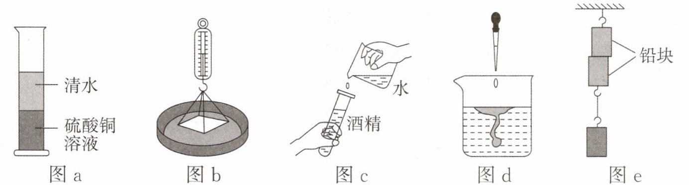 图e:将两个底面干净、平整的铅块紧压在一起,两个铅块就会结合在一起,下面吊一个较重的物体也不会将它们拉开。