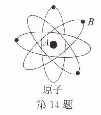 14. 在探索微小粒子的历程中,科学家发现原子是可分的。如图所示,A是______;B是______;A中带正电的微粒是______。(均填微粒的名称)