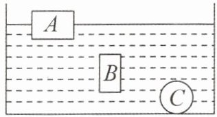 13. 如图,$ A $、$ B $ 体积相同,$ B $、$ C $ 质量相等,将它们放入水中静止。$ A $ 漂浮、$ B $ 悬浮、$ C $ 沉底,则下列说法正确的是 ()