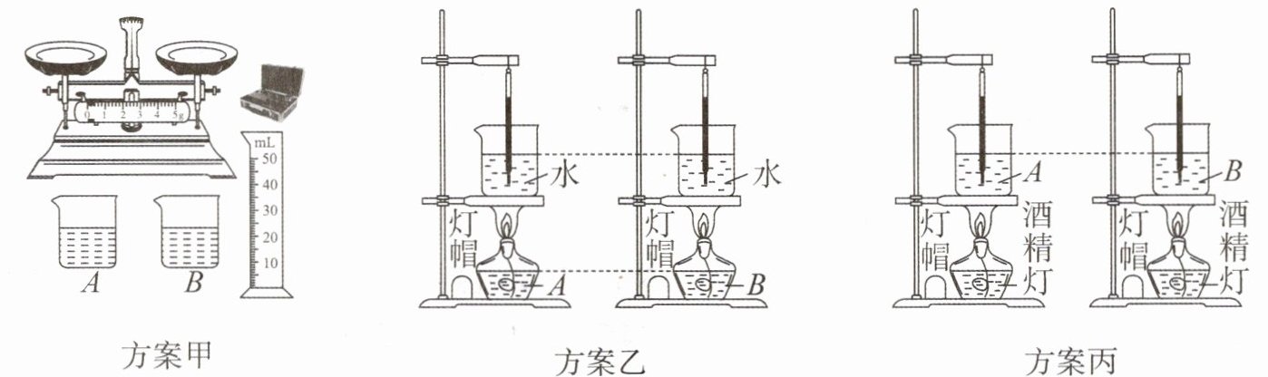 (2) 方案乙可根据A、B液体的______不同进行鉴别,当把两同规格烧杯内的水由常温都加热至$90^{\circ}C$,同规格燃料瓶内剩余较多的液体是______;