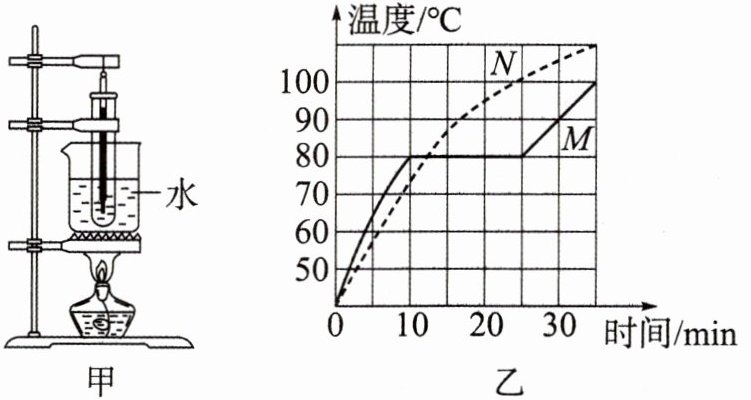 2. 用如图甲的两套相同装置,分别对相等质量的固体$M$、$N$加热。温度随加热时间变化的曲线如图乙,在$35min内M$物质从固体熔化成了液体,$N$物质始终是固体。关于则下列说法错误的是 ()