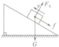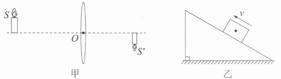 (2) 如图乙所示,一个质量分布均匀的正方体物块以初速度 v 沿着表面粗糙的固定斜面向上运动,请在图中作出该物块在向上运动的过程中,其所受力的示意图(力的作用点画在物块的重心,且不计空气阻力)。