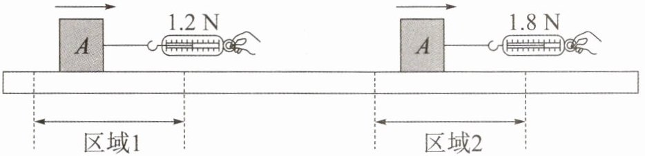 16. 如图所示,小明在测量滑动摩擦力大小时,将物块 A 置于水平木板上,用弹簧测力计水平向右拉物块 A,使其始终沿着木板做匀速直线运动,经过区域 1 和区域 2 时,弹簧测力计的示数分别为 1.2 N 和 1.8 N,据此可以判断木板上______(选填“区域 1”或“区域 2”)的粗糙程度更大。