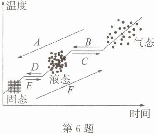 6. 图中A、B、C、D、E、F分别表示一种物态变化,下列几种物态变化现象中:①晾在室外的湿衣服变干了;②夏天,从冰箱里拿出的冰矿泉水瓶外出现水珠;③冬天,河面上结了一层冰;④放在衣柜里的樟脑丸会越来越小,最后“消失”了;⑤严冬的深夜,教室窗玻璃内表面上有一层冰花;⑥北方寒冷的冬天,雪人“变矮”了,属于F物态变化的现象是______(填写序号,下同);属于B物态变化的现象是______;A物态变化过程要______热量。