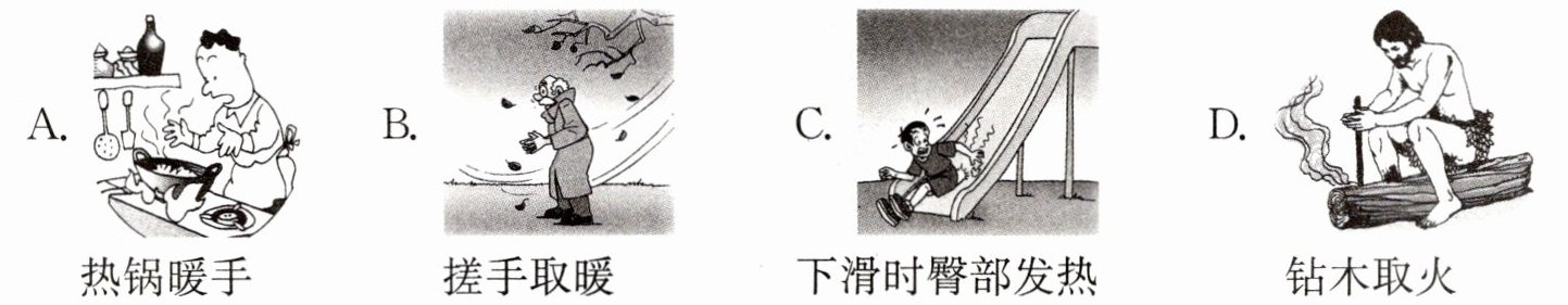 解析:反复弯折铁丝,铁丝发热,是利用做功来改变物体内能,故A不符合题意;两手掌相互摩擦,手掌发热,是利用做功来改变物体的内能;故B不符合题意;钻木取火是通过摩擦产生热量,是利用做功改变物体的内能,故C不符合题意;晒太阳时,人体吸收热量,感到暖和,是通过热传递改变物体内能,故D符合题意。