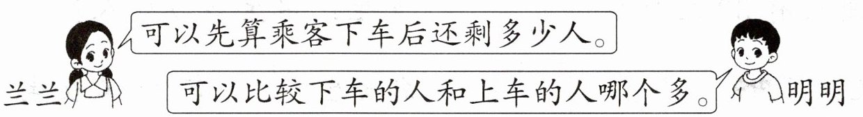 3. 原来公交车上有 36 名乘客,到达某一站时,有 24 人下车,17 人上车。现在公交车上的乘客人数多了还是少了?多了或少了多少人?下面是两名同学的思路。
